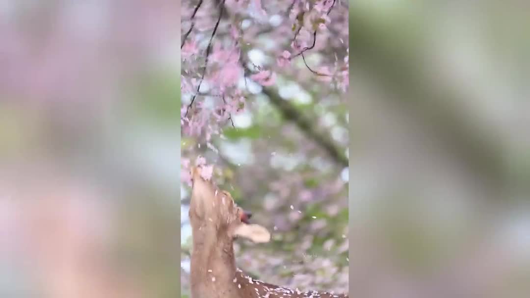 Завораживающее: на видео сняли самца оленя, который лакомится цветами сакуры
