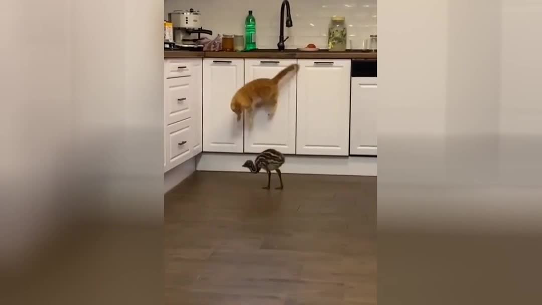 «Это еще что!?»: реакция кота на знакомство с маленьким эму попала на видео