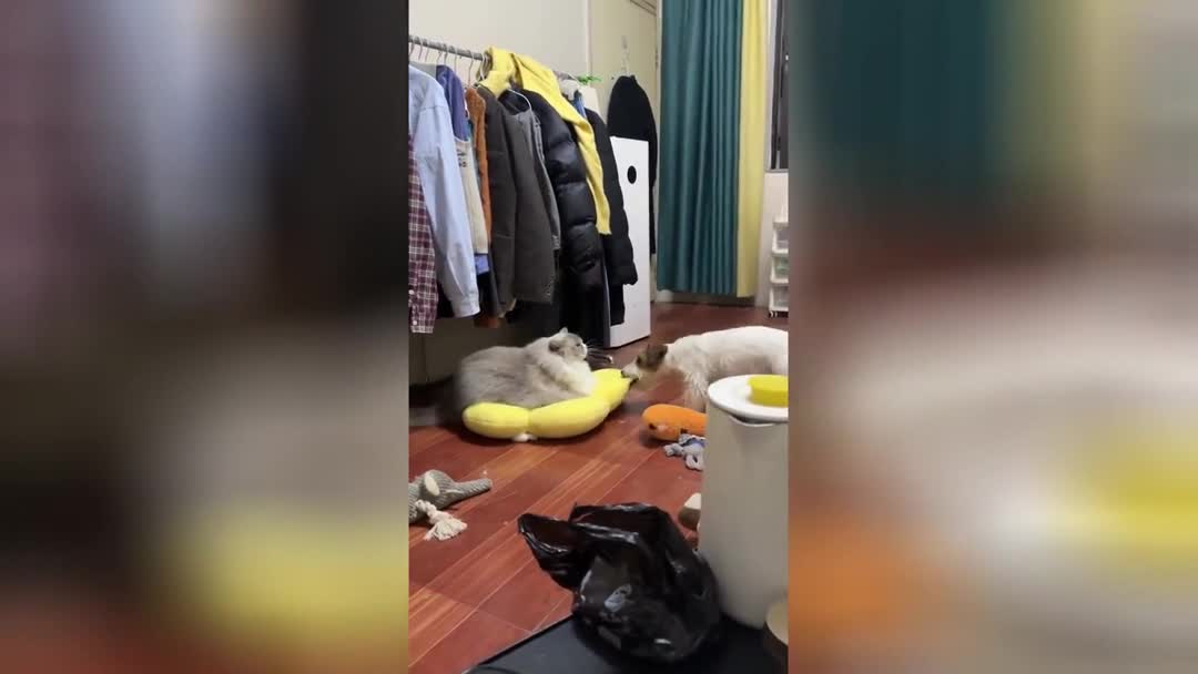 «Отдай!»: пес попытался отобрать лежанку у кота, но тот был невозмутим