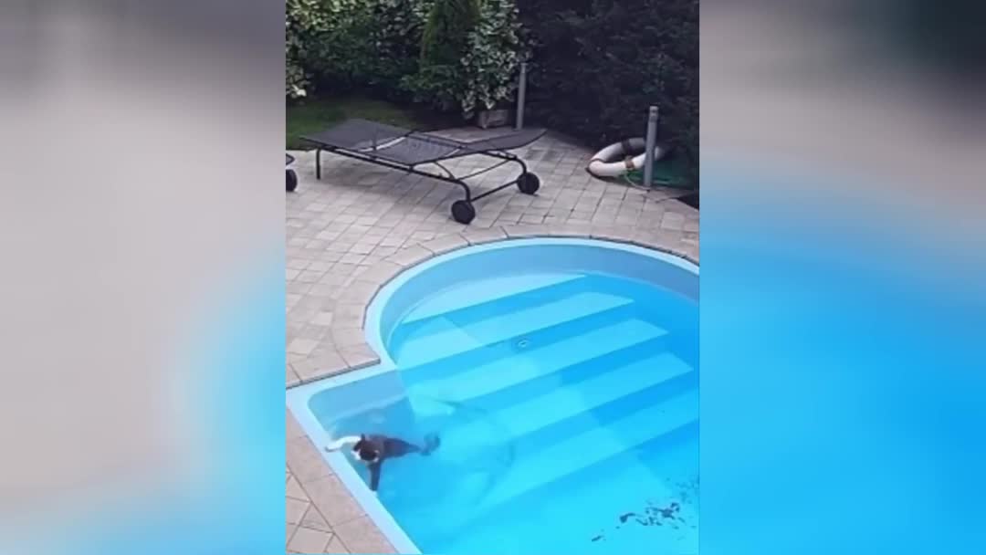 Котик упал в бассейн и внезапно узнал, что неплохо умеет плавать