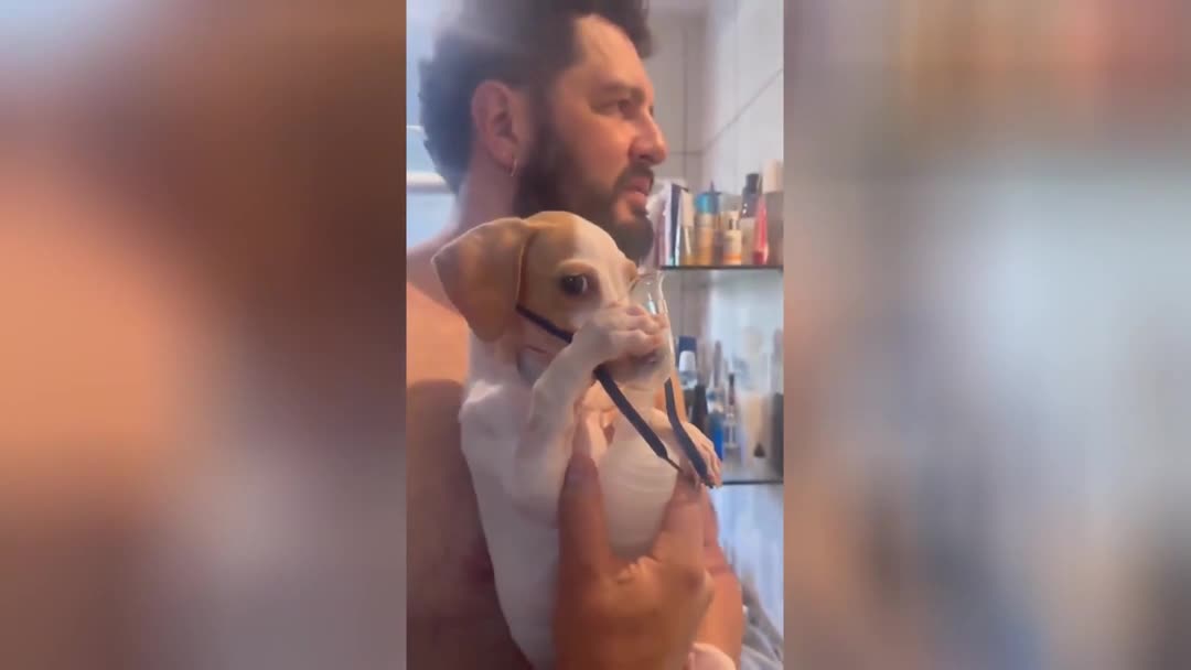 Песик с астмой держит маску для ингаляций, понимая, что это облегчает ему жизнь