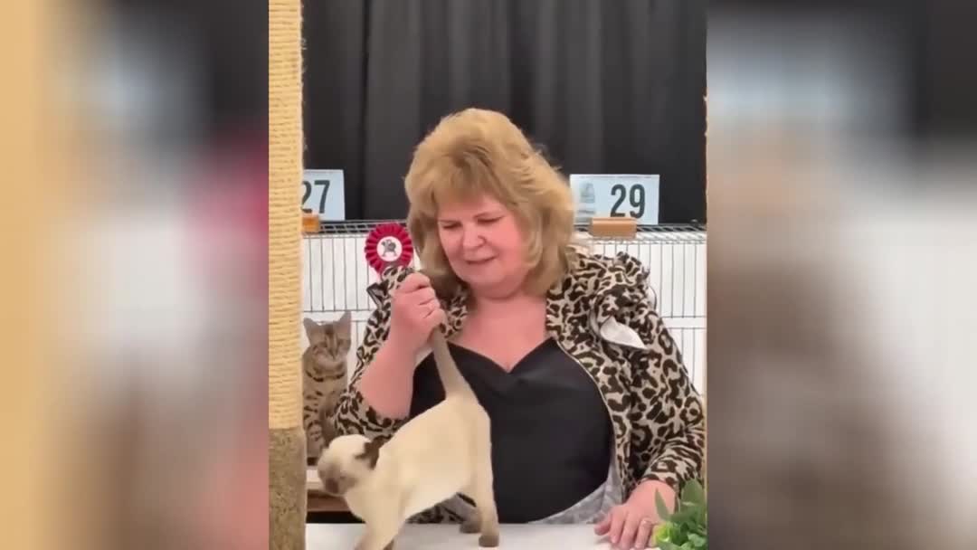 На видео сняли выставочного котика, который пытается подкупить судью лаской