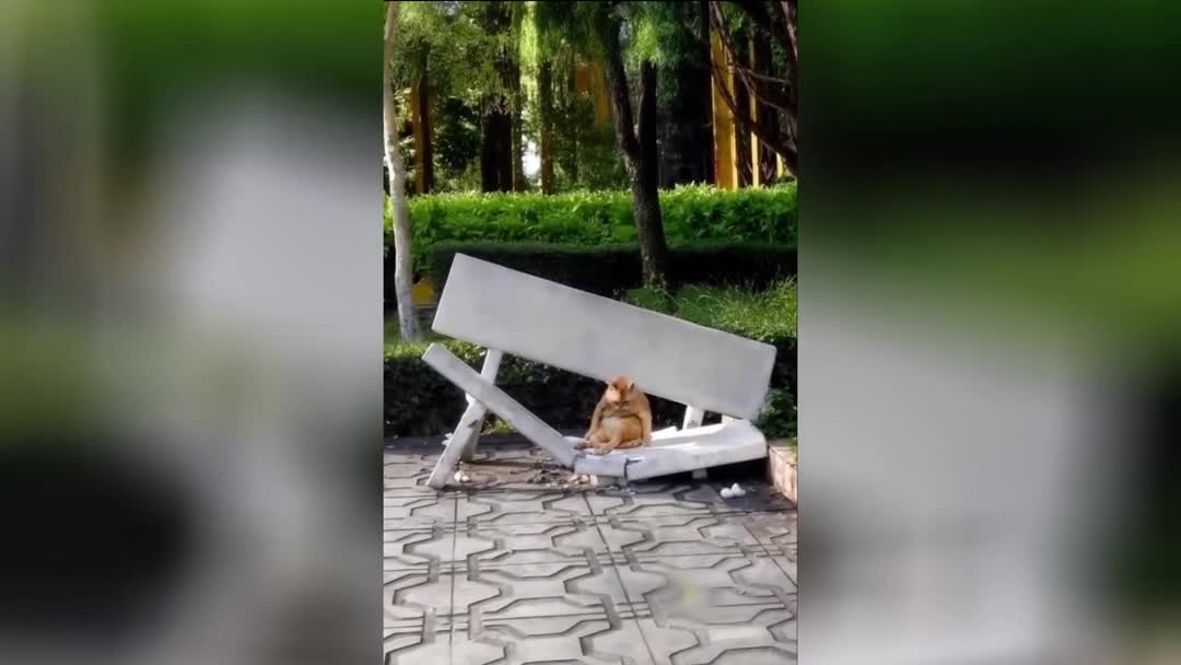 Пухлый рыжий кот устроил себе царский трон из разрушенной лавочки в сквере